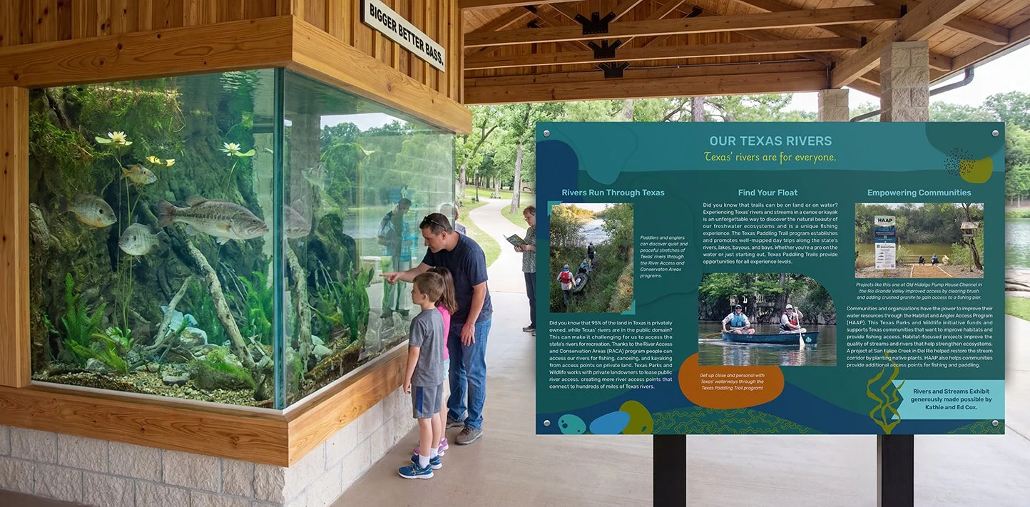 In partnership with Sarah Lisle Studios, I developed a interpretive design system and graphic library for Texas Freshwater Fisheries Center (TFFC) based on client goals — to inspire curiosity and advocacy for the state’s freshwater resources among visitors of all ages and walks of life.